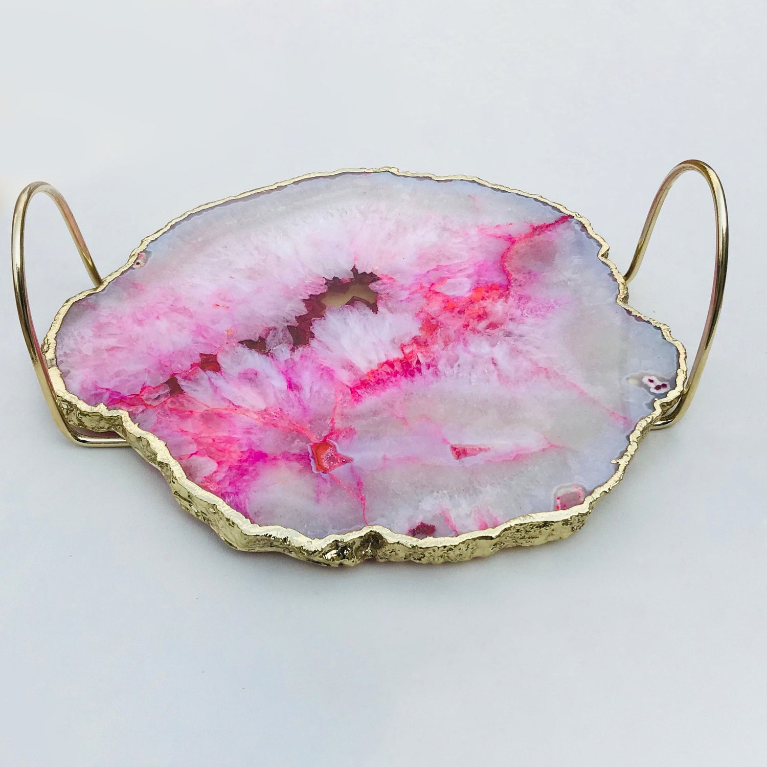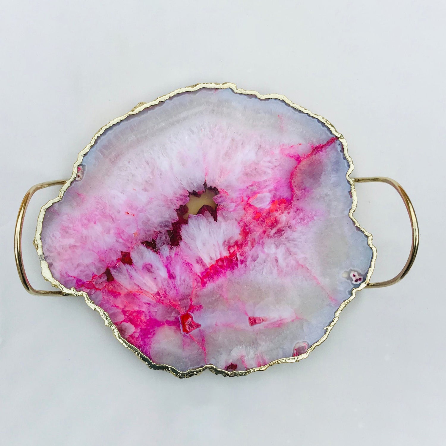 The natural look of agate stone creates a unique abstract pattern on this serving board. Hand hewn from natural agate and trimmed with brass plating, this incredibly ornate serving tray is roomy enough for all your entertaining staples, from wine and cheese to fruit and nuts.